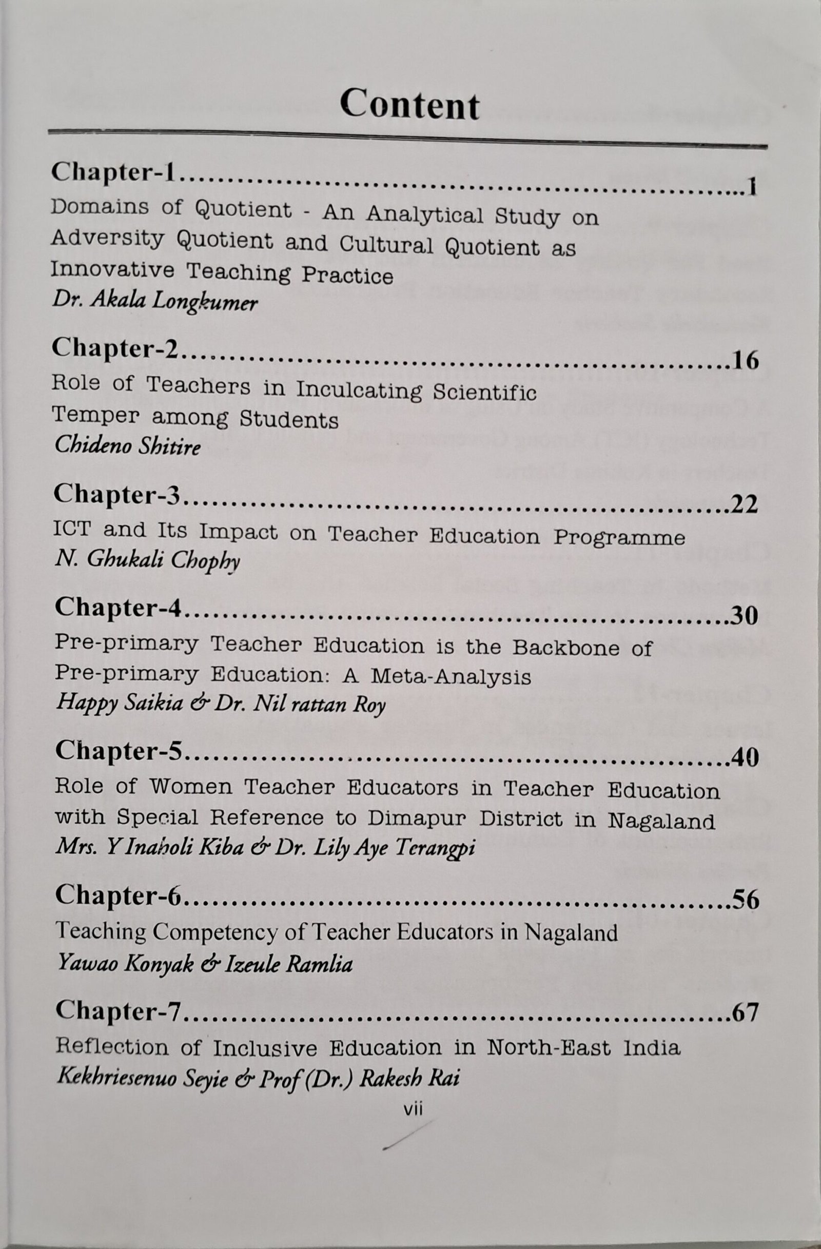A Two-Day National SEMINAR was held at Unity College of Teacher Education, Dimapur on August 23-24, 2019 with the topic “ISSUES AND CHALLENGES IN TEACHER EDUCATION” and papers were called for publication and presentation. The scholars, intellectuals and educationists have presented and submitted their articles for publication and this collection has been reflected here as the chapters of the Edited Book with ISBN.